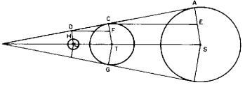 Para relacionar as distâncias e os tamanhos do Sol e da Lua a raio da Terra, Aristarco observou o que acontece durante um eclipse da Lua, quando este satélite atravessa o cone de sombra da terra (Fig. 5). Pelo tempo gasto nessa travessia, ele calculou que o diâmetro do cone de sombra da Terra, na altura da Lua, era 8/3 do diâmetro da Lua. Na Fig. 6. L, T, S são os centros da Lua, da Terra e do Sol, respectivamente; LH = RL, TC = RT e SA = RS são os respectivos raios; LD é o raio do cone de sombra da altura da Lua, de sorte que LD = 8RL/3. Da semelhança dos triângulos DFC e CEA resulta: