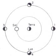 Para constatar que o Sol está mais distante da Terra que a Lua, basta observar atentamente as várias fases da Lua. Se ela estivesse mais longe de nós que o Sol, então, por simples análise de suas várias posições relativamente ao Sol e à Terra (a Fig. 1 ilustra quatro dessas posições), concluímos que ela estaria sempre iluminada pelo Sol quando vista da Terra. Em particular, não haveria lua nova! E haveria duas posições da Lua, em 1 e em 3, onde ela seria lua cheia, esta última em pleno meio-dia, o que nunca acontece realmente. A hipótese contrária, de que o Sol está mais distante da Terra que a Lua, é a única compatível com as várias fases da Lua, em particular com a ocorrência de luas novas. Outro fato a corroborar esta hipótese é a ocorrência de eclipses do Sol, que só são possíveis com a Lua mais próxima da Terra que o Sol.