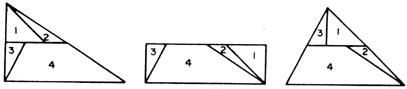 Fig. 8. Superpondo as duas decomposições de R, uma dada na figura 1 e outra na figura 2, obtemos quatro polígonos, numerados 1, 2, 3 e 4, os quais podem ser reposicionados para formar o triângulo T e o triângulo T". Portanto, T e T' são eqüidecomponíveis.
