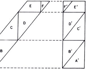 de tal modo que cada polígono Pi é congruente ao polígono P'i (i = 1, 2, ..., n). Além disso, exige-se que os polígonos Z3, tenham seus interiores dois a dois disjuntos, o mesmo ocorrendo com os Pi'. Os três exemplos vistos acima mostram que todo triângulo é eqüidecomponível com um retângulo. Evidentemente, dois polígonos eqüidecomponíveis têm a mesma área. A recíproca não é evidente, mas é verdadeira. Dois polígonos com a mesma área são eqüidecomponíveis. Este teorema foi demonstrado em 1832 por F. Bolyai e, independentemente, em 1833 por P. Gerwien. F. Bolyai era o pai do famoso matemático húngaro Janos Bolyai, descobridor da Geometria Hiperoonca (.que também loi descoberta por Lobatchevski e Gauss). Gerwien era um matemático amador alemão. O teorema de F. Bolyai é um fato geométrico interessante, cuja prova se baseia em argumentos bem simples. Daremos a seguir uma série de exemplos de polígonos eqüidecomponíveis, preparando o caminho para a demonstração desse teorema. As figuras 4 e 5 mostram que todo paralelogramo é eqüidecomponível com um retângulo que tem a mesma base e a mesma altura. Na figura 4 é possível traçar uma altura interior ao paralelogramo. (Isto sempre ocorre quando a base do paralelogramo é o seu maior lado.) Na figura 5, qualquer altura cai no exterior do paralelogramo.
