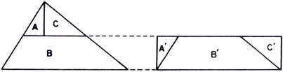 Fig. 2. Primeiro corta-se o triângulo com uma paralela à base, traçada pelo ponto médio de um dos lados inclinados. Depois corta-se o pequeno triângulo superior ao longo da altura. O triângulo original fica decomposto no trapézio B e dois triângulos retângulos A e C, os quais são facilmente reposicionados, em B', A' e C, para formar um retângulo, com base igual à do triângulo dado e altura metade.