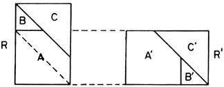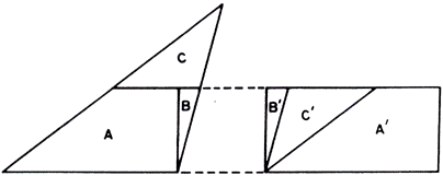 Fig. 3. (A altura do triângulo incide sobre o prolongamento da base.) Decompõe-se o triângulo em três partes A, B, C, que são recolocadas em A', B' e C para formar o retângulo procurado. A fim de tornar esta ideia mais precisa, daremos a seguinte Definição. Dois polígonos P e P' dizem-se eqüidecomponíveis quando existem decomposições.