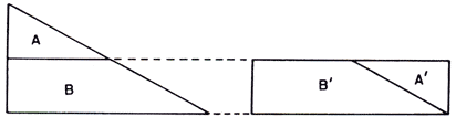 Fig. 1. A paralela à base, traçada pelo ponto médio da altura, decompõe o triângulo em duas partes (o triângulo A e o trapézio B), as quais são reposicionadas em B' e A ' para formarem um retângulo com base igual à do triângulo e altura metade.