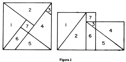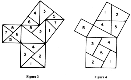 Já o Prof. da Silva decompõe um quadrado de lado a em quatro triângulos iguais ao dado e mais um quadradinho menor. Esses 5 polígonos são então reagrupados para formar uma figura equivalente à justaposição de um quadrado de lado b mais outro de lado c. Faltou-lhe muito pouco para que resolvesse o problema acima. Bastava ter cortado dois dos seus triângulos, obtendo a figura 2 onde o quadrado maior, de lado a, ficou decomposto em sete polígonos, os quais são depois reagrupados para formar dois quadrados, de lados b e c. Assim, podemos considerar que a construção do Prof. da Silva resolve o problema posto no início. Nosso interesse em mencionar esse fato deve-se a uma observação feita por Vladimir Boltyanskii em seu excelente livrinho Equivalem and equidecomposable figures (D.C. Helth and Co., Boston, 1963, p. 9). Ali, o autor diz que o Teorema de Pitágoras é facilmente demonstrável pelo método da complementação, o qual consiste no seguinte: para provar que duas figuras A e B têm a mesma área, acrescentam-se sucessivamente a A e a B figuras, duas a duas congruentes, até obter novas figuras que sejam congruentes. E, para ilustrar, mostra exatamente a construção da figura 1. Em seguida, diz Boltyanskii: "À guisa de comparação, apresentamos aqui um desenho que indica como o Teorema de Pitágoras pode ser provado pelo método da decomposição". E mostra a figura 3. Isso deixa a impressão de que o problema enunciado acima tem uma solução necessariamente complicada. Em particular, nenhum dos triângulos numerados de 1 a 8 na figura de Boltyanskii é retângulo. Como acabamos de ver, a prova do Teorema de Pitágoras pelo método de decomposição pode ser feita de modo mais simples do que esse da figura 3. Mas existe outra maneira, mais simples ainda, que consiste em subdividir o quadrado de lado a em apenas 5 quadriláteros, um dos quais é o quadrado de lado c (supondo c < b) e os outros quatro podem ser agrupados para formar o quadrado de lado b. Na realidade, a construção (conhecida como a dissecção de Perigai) começa traçando uma paralela e uma perpendicular à hipotenusa a, as quais se cortam no centro do quadrado construído sobre o cateto b. Essas duas linhas decompõem o quadrado de lado b em quatro partes, as quais são transladadas para preencher parte do quadrado de lado a, sobrando um quadradinho (número 5) no meio, o qual tem lado c. Vide figura 4. (Cfr. Mathematical Gazette, 1932, P. 44.)