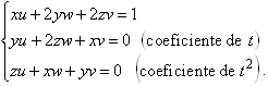 Solução x + yt + zt2, nas condições do problema, só é igual a zero se x = y = z = 0. A igualdade (x+ yt + zt2) . (u + vt + wt2) = 1 é, então, equivalente ao sistema