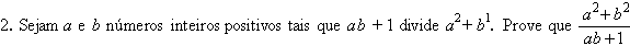 A 29.ª Olimpíada Internacional de Matemática realizou-se em Canberra, Austrália, em julho deste ano. Contou com a participação de 49 países, num total de 268 estudantes. Os países que tiveram melhor desempenho foram União Soviética, Romênia, China, Alemanha Ocidental e Vietnã, nessa ordem. Dois integrantes da equipe brasileira, Jun Takakura e Lenilson Barreira de Morais receberam menção honrosa pelo seu desempenho nesta olimpíada internacional. Os problemas propostos foram bem mais difíceis do que os da Ibero-americana. Transcrevemos abaixo dois dos problemas propostos: o primeiro teve o maior índice de acertos, 98 em 268; o segundo teve o menor índice de acertos: apenas 11 em 268. 1. Consideram-se duas circunferências concêntricas e coplanares de raios R e r(R > r). Sejam P um ponto fixo da circunferência menor e B um ponto variável que percorre a circunferência maior.Areta BP volta a concorrer com a circunferência maior no ponto C. A perpendicular / a BP por P volta a concorrer com a circunferência menor no ponto A (se / for tangente a essa circunferência em P, A = P). a) Determine o conjunto de valores da expressão BC2 + CA2 + AB2. b) Determine o lugar geométrico descrito pelo ponto médio de AB.