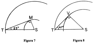 é, em média, de 23°. Quando isso acontece (fig. 7) o triângulo STM é retângulo em M, logo, SM = ST . sen 23° * 0,39 ST. Vemos assim que Mercúrio dista do Sol 0,39 vezes a distância da Terra ao Sol. O planeta Vênus, por sua vez, tem elongação que atinge valor máximo de 47°. Portanto, sua distância ao Sol é (fig. 8) SV = ST . sen 47° * 0,73 ST.