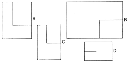 Entregar a cada aluno uma folha em branco a ser colocada num certo canto da carteira. Entregar outra folha na qual estejam desenhadas quatro figuras: A, B, C e D (ver fig. abaixo). Destas, apenas duas, B e D, representam o tampo da carteira com a folha no canto, em escalas, por exemplo, de 1/5 e 1/10. Na primeira, A, a folha está com as dimensões proporcionais às da real, mas a carteira não; e na terceira, C, a carteira está reduzida corretamente, mas a folha não. Discutir com os alunos as respostas a perguntas do tipo: qual(is) das figuras poderia(m) ser uma fotografia da carteira com a folha? Por quê?