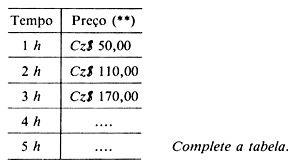 E — Por que você fez assim? A — Porque é mais fácil. E — Sempre é possível? A — Depende do problema. Para refletir sobre a questão (a) acima, o entrevistador apresenta à, aluna outro problema. E — Resolva esse outro problema. Priscila foi ao supermercado com a sua mãe. Como o estacionamento grátis do supermercado estava lotado, sua mãe precisou deixar o carro num outro estacionamento rotativo, que tinha a tabela de preços abaixo: