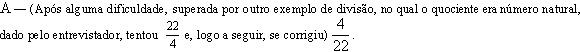 Embora reconhecendo que a decomposição dos dados em parcelas e a utilização de multiplicações por fatores bem simples é suficiente para os alunos resolverem a grande maioria dos problemas a eles apresentados, deparamo-nos com duas questões, a saber: (a) Os alunos, que resolvem os problemas de proporcionalidade pelo modelo aditivo (decomposição em parcelas), sabem por que podem fazer isso? (b) É aconselhável levar esses alunos a resolver tais problemas pelo reconhecimento da igualdade de duas razões? A esse respeito, relataremos, a título de exemplo, entrevista feita com aluna da 7.ª série, ao final do estudo do tópico de proporções. Ressaltamos a importância do método de entrevista para melhor conhecer o raciocínio do estudante, mas lembramos que o exemplo aqui apresentado não deve ser encarado como um modelo a ser repetido. Outros alunos darão outras respostas e outras respostas exigem novas perguntas. E — Resolva esse problema: Numa creche, 4 litros de leite dão para preparar 22 mamadeiras iguais. Quantas mamadeiras iguais a essas poderão ser preparadas com 10 litros de leite? A dificuldade essencial, nesse caso, é reconhecer 10 como um múltiplo de 4. Pesquisas realizadas na Inglaterra (***) indicam que muitos alunos acreditam que não existe um número que multiplicado por 4 dê 10. Tal dificuldade é contornada pelo uso do modelo aditivo. A— 4—10 22 — 55 mamadeiras E — Explique o que você fez.