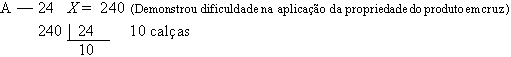 E — Você não pode resolver esse problema pelo seu método? A — Não sei. E — Faça como você fez no primeiro. A — Mas no primeiro, eu multipliquei, e agora, de 24 para 15 não posso multiplicar. E — Mas você não pode dividir? A — Posso (mas não fez).