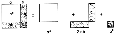 Veja: nós entendemos o produto notável (a + 6)2 como "o quadrado do primeiro termo, mais duas vezes o produto do primeiro termo pelo segundo, mais o quadrado do segundo termo", isto é, (a + b)2 = a2 + 2ab + b2 Euclides e seus colegas de Alexandria também manejavam com muita facilidade este produto notável, mas interpretando-o através desta construção geométrica: