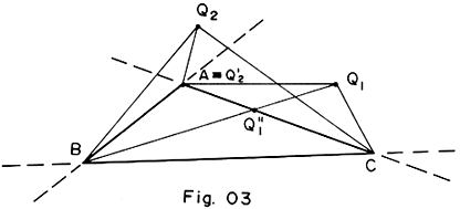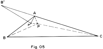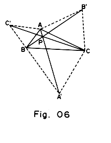 A prova deste fato está esquematizada no desenho acima. Temos que considerar, separadamente, os pontos das duas regiões do plano (Q = Q1, Q = Q2) I) Vamos considerar primeiramente o caso em que os ângulos do triângulo ABC não excedem 120° (Fig.4). Queremos encontrar o valor mínimo para d = AP + BP + CP, onde P é um ponto de região triangular fechada.