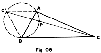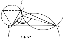 Observamos que o valor mínimo para a soma das distâncias aos vértices é o comprimento de qualquer um dos segmentos AA', BB' ou CC. Outra forma de se determinar o ponto de Fermat P ê baseada na constatação feita em (I) de que este "olha" todos os lados do triângulo sob um ângulo de 120° : P é determinado pela intersecção dos arcos-capazes correspondentes (Fig. 7).