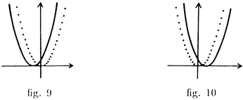 Vamos usar novamente o gráfico de y = x2 como auxílio (curva pontilhada nas figs. 9 e 10). Começamos marcando os valores x e x + k no eixo x, o ponto (x + k, (x + k)2) no gráfico de y=x2, e queremos localizar (x,(x + k)2). 1. Se k > 0, temos x < x + k e, portanto, o ponto (x,(x + k)2) se encontra à esquerda de (x + k,(x + k)2), na mesma reta horizontal. Vemos assim que o gráfico de f é obtido a partir de y = x2 deslocando-se este de k unidades para a esquerda (fig. 9).