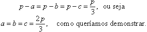 Provar que, de todos os triângulos de mesmo perímetro, o equilátero possui a maior área. Solução: Consideremos um triângulo de lados a, b e c com a + b + c = 2p. A área S desse triângulo é dada pela fórmula de Heron,