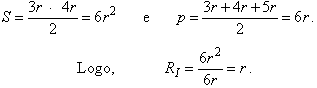 Os lados são, portanto, 3r, 4r e 5r. O raio do círculo circunscrito a um triângulo retângulo é igual à metade da hipotenusa; logo, o raio do círculo circunscrito é Rc = 5r/2. O raio do círculo inscrito em um triângulo qualquer é R1 = S / p, onde S é a área e p o semiperímetro do triângulo. No caso temos,