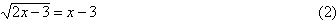 substituindo Vejamos um exemplo onde este fato é mais evidente: x = 2 (o conjunto solução é {2}), 2 = x ( equivalente a de cima). Substituindo uma na outra, obtemos x = x, cujo conjunto solução é IR! Assim, o aparecimento de uma raiz falsa não está ligado ao fato de a equação ser irracional nem as potências que tomamos, e sim. ao procedimento da resolução. Uma palavra sobre a abordagem deste tema em sala de aula: o "truque" utilizado na passagem de (3) para (4) é útil, pois "limpou" a equação, mas não é uma equivalência - não podemos perder de vista a equação original. Situações como esta são comuns, por exemplo, na trigonometria quando usamos, numa equação, a identidade sen2 x + cos2 x = 1. Vamos ilustrar o aparecimento de falsas raízes através de mais dois exemplos: