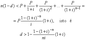 Então, no caso em questão, a compra à vista com desconto é mais vantajosa. No caso geral, "à vista com desconto de taxa d, ou, em n parcelas iguais sem juros" (a primeira parcela paga no ato da compra), a compra à vista é mais vantajosa se, e só se,