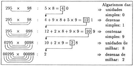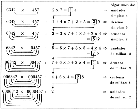 6342 x 457 = (6 x 1000 + 3 x 100 + 4 x 10 + 2) x (4 x 100 + 5 x 10 + 7) = 2898294. Constatei, em sala de aula, que este algoritmo desperta o interesse dos alunos e lhes proporciona uma oportunidade de efetuar cálculos montais. Para que os alunos não se atrapalhem, eu os oriento para que utilizem os dedos indicadores das mãos, deslocando-os como indicado nas diversas linhas da primeira coluna em cada um dos quadros.
