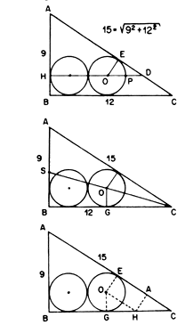 A solução do professor Frias começa construindo o retângulo OEFH e considerando a semelhança entre os triângulos OGH e ABC, donde tira que r / GH = 9 /12. Da semelhança entre os triângulos HFC e ABC tira que r / HC = 9 /15. Como 3r + GH + HC = 12, dá também para concluir que r = 2 .