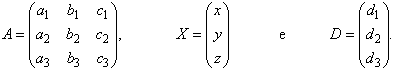 Fazendo uso da multiplicação de matrizes, esse sistema pode ser escrito sob a forma A . X = D.