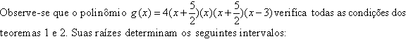 Dessas quatro observações, podemos concluir que Fica assim demonstrado o seguinte teorema: TEOREMA 2: Seja, f(x) um polinômio real com todas as suas raízes reais e simples, e sejam Ip e Ip+1 dois intervalos consecutivos quaisquer. Então, em Ip e Ip+1, f(x) terá sinais contrários. Isto é, f(x) assume valores numéricos de sinais contrários, quando a variável x passa de um intervalo a um intervalo consecutivo.