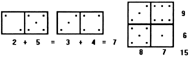 As peças de dominó têm sido usadas em sala de aula, nas séries iniciais, para efetuar e fixar pequenas somas. Por exemplo: