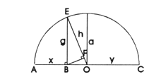 Os pontos A, B e C são sucessivos e colineares. A distância de A até B é x e a distância de B a C é y. A circunferência de diâmetro igual x + y tem centro O e raio a e a perpendicular à reta AC pelo ponto B encontra a circunferência supra-referida em E, sendo a distância de B até E igual a g. A perpendicular por B à reta OE intercepta tal reta no ponto F. A distância de E até F é igual a h.