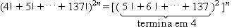 Assim, 5! + 6! + . . . +137! é uma adição em que todas as parcelas são múltiplos de 10 e, portanto, a soma é múltiplo de 10 (na verdade, esse resultado independe de estarmos considerando uma soma até 137!). Como 5! + 6! + . . . + 137! termina em 0 e 4 ! = 24, o número 4 ! + 5 ! + . . . +137! termina em 4. Assim, temos: