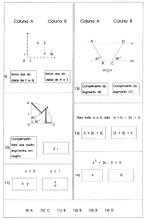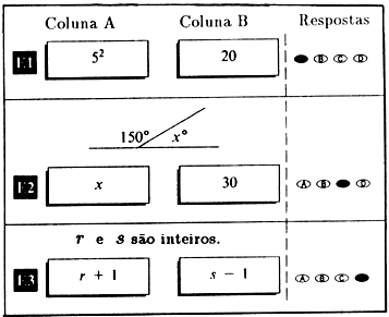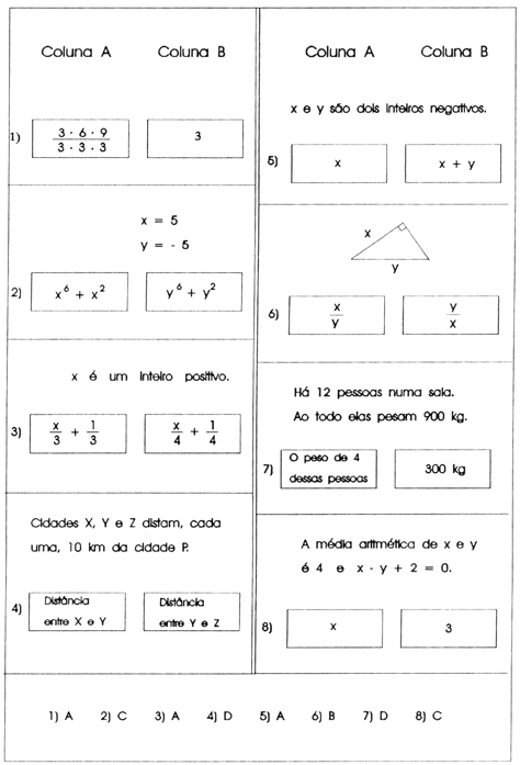 Em cada teste há duas quantidades, uma na Coluna A e outra na Coluna B. Você deve comparar as duas quantidades e na folha de respostas assinalar: A se a quantidade na Coluna A for a maior; B se a quantidade na Coluna B for a maior; C se as duas quantidades forem iguais;