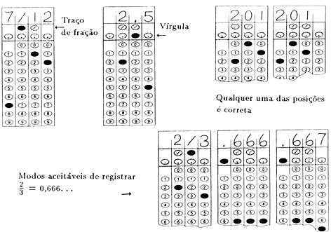 Os testes são problemas com soluções numéricas. A novidade está no fato de o aluno precisar produzir a resposta e não escolhê-la dentre algumas alternativas. Como o SAT é, atualmente, prestado por mais de um milhão de estudantes, a sua correção, necessariamente, tem que ser feita por máquinas (não por pessoas). O modo de proceder é o seguinte: para cada problema há, na folha de respostas, uma pequena "grade" onde o aluno colocará a resposta. As "grades" abaixo ilustram o processo: