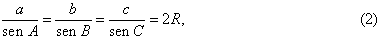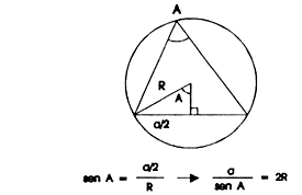 a = sen A , etc. Então, para um triângulo inscrito lesse círculo, a fórmula (1) se lê: sen A = sen B cos C + sen C cos B . E como, finalmente, o ângulo A é o suplemento de B + C, ou seja, têm o mesmo seno, obtém-se a célebre fórmula: