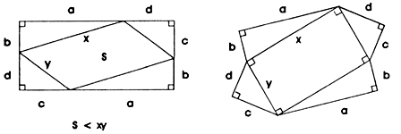 Uma demonstração rápida e "visual" de (3) é devida a R. Nelsen na mesma revista citada: v. 67, n° 1, fevereiro de 1994, e baseia-se na observação "evidente" - nada mais que "a oblíqua é maior que a perpendicular" - de que, fixados os comprimentos dos lados de um paralelogramo, sua área máxima ocorrerá quando ele for um retângulo. Considere então as figuras: