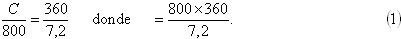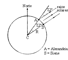 portanto, a relação (1) nos dá: C = 800 x 50 = 40 000 km. O raciocínio de Eratóstenes ressalta ainda a proporcionalidade de ângulos e arcos, quando visto na sua forma original, assim: se uma volta completa corresponde a 360 graus, que é 50 vezes 7,2 graus, o comprimento dessa volta também será 50 vezes 800 km, isto é, C = 40 000 km.