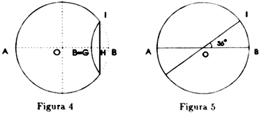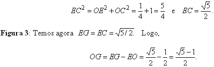 Para justificar que a seqüência, de dobraduras que apresentamos fornece um processo exato para a construção de um ângulo de 36°, vamos observar novamente as figuras e efetuar alguns cálculos. Figura 1: Consideremos o raio da circunferência igual a 1. Figura 2: Como o ponto E é médio de O A, ternos OE = 1/2. No triângulo EOC temos: