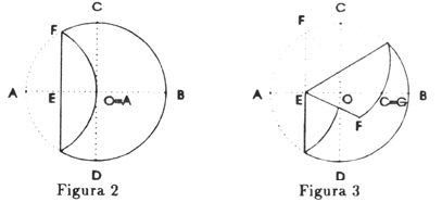Figura 2: A primeira dobra faz o ponto A coincidir com O. Com isso, obtemos os pontos E e F. Figura 3: A segunda dobra passa pelo ponto E e faz com que C fique sobre o raio OB. Vamos chamar de G esse novo ponto.
