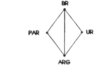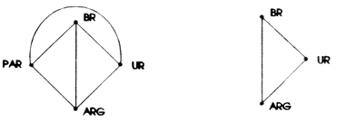 Reduzindo o problema à análise de grafos, estamos dividindo o grafo original em dois outros diferentes. O primeiro corresponde a um grafo completo de 4 vértices, e o segundo, a um grafo de 3 vértices, como se o Uruguai (ou o Paraguai) fosse eliminado da questão: