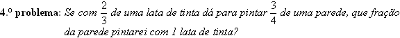 Associar esse tipo de problema com a divisão do número de paredes pelo número de latas de tinta. 3.° problema: Se com 1/2 lata de tinta eu pinto uma parede, quantas paredes eu pintarei com l lata de tinta? Observe que dividimos a lata de tinta em duas partes. Se com uma parte dá para pintar l parede, com 2 partes dá para pintar 2 x 1=2 paredes.