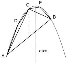 Arquimedes (287-212 a.C.) foi o maior matemático da Antiguidade e, ao lado de Newton (1642-1727) e Gauss (1777-1855), é considerado um dos três maiores matemáticos de todos os tempos. Em seus cálculos de áreas e volumes estão os germes do Cálculo Integral, que só se desenvolveria de maneira sistemática a partir do século XVII. O leitor interessado pode ler mais sobre Arquimedes na RPM 9, págs. 11 a 15. e na RPM 10, págs. 11 a 19. Para explicar o aparecimento de uma série geométrica num trabalho de Arquimedes, consideremos o cálculo que ele faz da área de um segmento de parábola, delimitado por um arco parabólico AB e um segmento retilíneo AB.