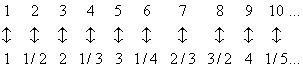 é o grupo de todas as frações cujos termos têm soma 5. Vamos fazer uma lista de todos esses grupos, começando com aquele cuja soma dos termos das frações é 2 (e que só contêm a fração 1/1); depois o grupo das frações 1/2 e 2/1, cuja soma dos termos é 3; e assim por diante, sucessivamente. Ao mesmo tempo, riscamos as frações que representam o mesmo número já representado por frações que apareceram antes. Eis a lista: