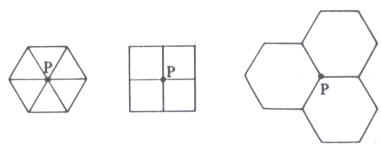 Problema 2 – Existem dois retângulos satisfazendo as condições dadas: Um é 4 x 4 e o outro, 3 x 6. Problema 3 – Duas respostas: 4 e 4 ou 3 e 6 são pares de inteiros cuja média harmônica é 4. Problema 4 – Os pares são idênticos ao do problema 3. Problema 5 – Os únicos polígonos regulares congruentes que, sem superposição, cobrem o espaço em torno de P (e assim cobrem o plano) são os polígonos de 3 lados (seis triângulos eqüiláteros em torno de P), os de 4 lados (quatro quadrados em torno de P) e os de 6 lados (três hexágonos regulares em torno de P), como se vê na Fig. 2.