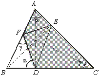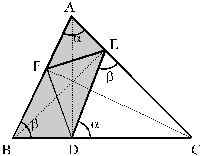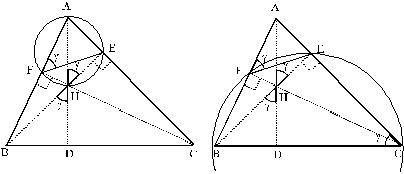 os quadriláteros inscritíveis vão fornecer a demonstração. A figura à esquerda foi propositadamente mal feita para evitar a tentação de fazer afirmações não justificadas sobre o alinhamento de D, E e F. A figura à direita, a ser olhada após a argumentação, está correta.