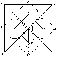 Problema 2 Seis esferas idênticas de raio r encontram-se posicionadas no espaço de tal forma que cada uma delas seja tangente a quatro esferas. Determine a aresta do cubo cujas faces tangenciam todas as esferas. RPM: Imaginando-se 4 bolas de tênis (ou de pingue-pongue, ou de gude) sobre uma mesa e uma quinta bola em cima, vêem as esferas na posição do enunciado, desde que se imagine a sexta bola parcialmente por baixo da mesa. Difícil é fazer o desenho. A RPM agradece a Delton Capozzi, autor da figura à esquerda. À direita vemos a interseção das 4 esferas com um plano que passa pelos seus centros. O quadrado ABCD é a interseção desse plano com o cubo.