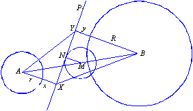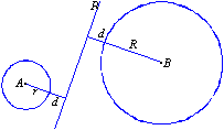 Reta eqüidistante de duas circunferências Um leitor de São Paulo pediu a solução do seguinte problema: Dados o ponto P e duas circunferências, traçar por P uma reta eqüidistante das duas circunferências e que as deixa em semiplanos opostos. RPM: Se uma reta e uma circunferência não têm pontos comuns, a distância da reta à circunferência é a diferença entre a distância do centro da circunferência à reta e o raio da circunferência (d na figura a seguir).