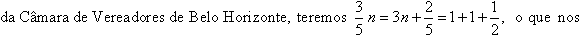 a) se o número de vereadores for múltiplo de 5, esse número será dividido por 5 e multiplicado por 3; b) se o número de vereadores não for múltiplo de 5, serão somadas tantas unidades quantas necessárias para se obter um múltiplo de 5 e, em seguida, divide-se esse número por 5 e multiplica-se por 3”. Não concordei. Afinal de contas, a lei não pode mudar uma regra matemática. E, para provar que o regimento estava errado, tomei de um lápis e expliquei: