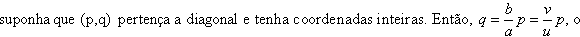 Logo, a diagonal fica dividida em d pedaços iguais. Como os d + 1 pontos são igualmente espaçados, os d retângulos obtidos no item 4 têm a mesma área m. Logo, md = ab, o que mostra que m = MMC(a, b), e m é também o número de quadradinhos contido nos retângulos.