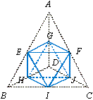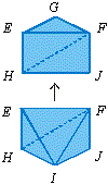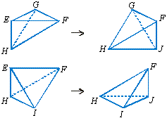 Na figura abaixo mostramos a decomposição dessas pirâmides nos quatro tetraedros (não regulares!) EFHG, HJFG, EFHI e HJFI congruentes entre si. Denotamos cada um desses tetraedros por t'.