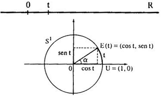 E (s + t) = cos (s + t) + i . sen (s + t), E(s) = cos + i . sen s, E(t) = cost + i . sen t e efetuarmos a multiplicação de números complexos indicada no segundo membro, ela se torna cos (s + t) + i . sen (s + t) = (cos . cos t – sen s . sen t ) + i . (cos s . sen t + sen s . cos t). Igualando as partes reais e imaginária dos dois membros, obtemos as fórmulas clássicas da Trigonometria: cos