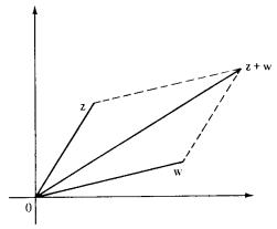 O primeiro passo nessa direção consiste em interpretar geometricamente um número complexo como um ponto do plano, em analogia com a imagem de um número real como um ponto de uma reta. Introduzindo coordenadas cartesianas por meio de dois eixos perpendiculares, cada ponto do plano é representado como um par ordenado z = (x, y) de números reais: sua abscissa x e sua ordenada y. Sendo o número complexo z = x + iy, em última análise (ou em princípio) um par de números reais, é natural identificar o número complexo z=x+iy com o ponto z = (x,y) do plano cartesiano. Feito isso, as operações de adição e multiplicação de números complexos devem possuir interpretações geométricas. Para a adição, não há dificuldade. Dados z = x + iy e w = u + iv, a soma z + w = (x + u) + i (y + v) é o quarto vértice do paralelogramo cujos 3 outros vértices são a origem 0 = 0 + i0 e os pontos z, w.